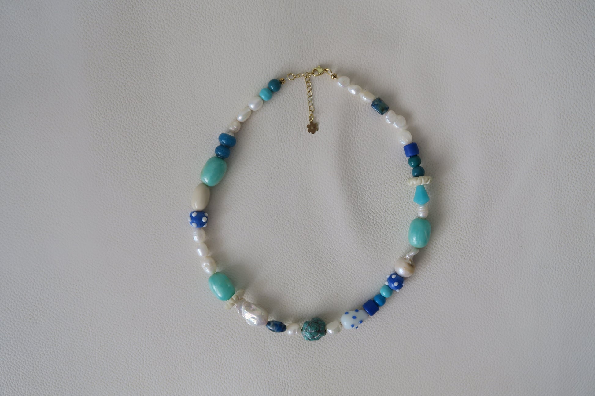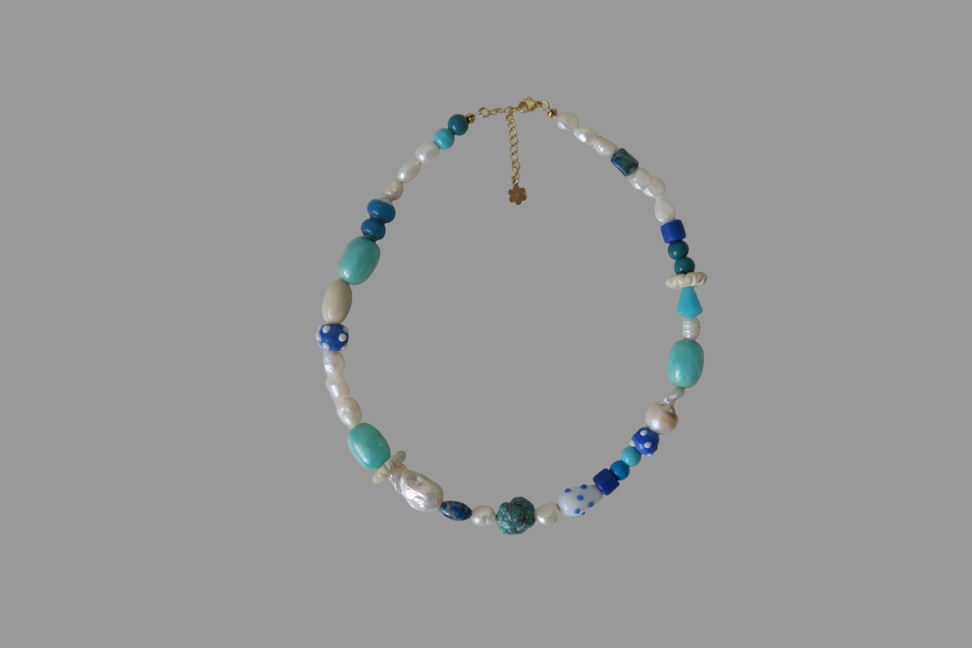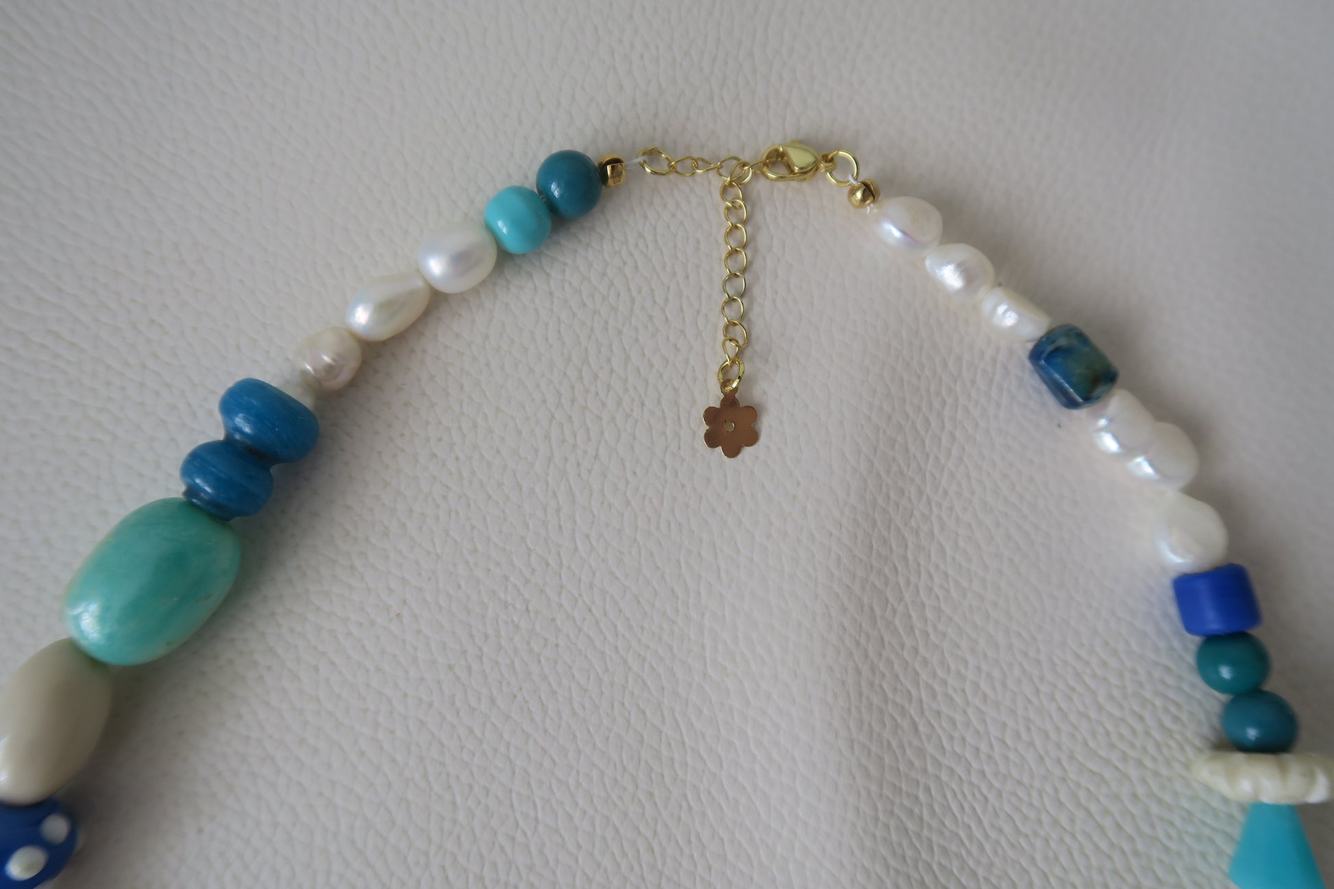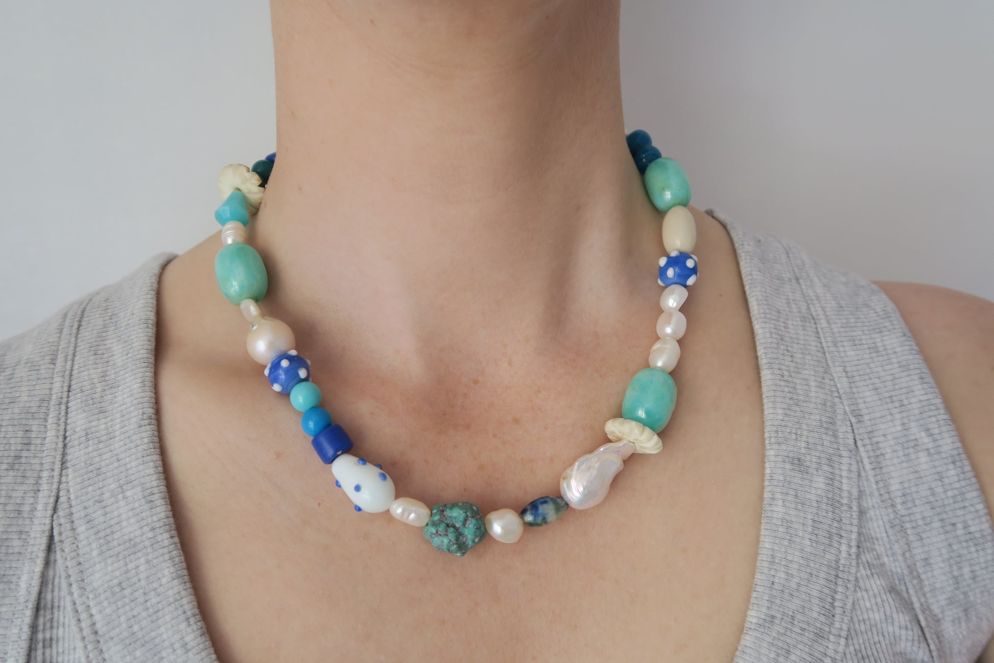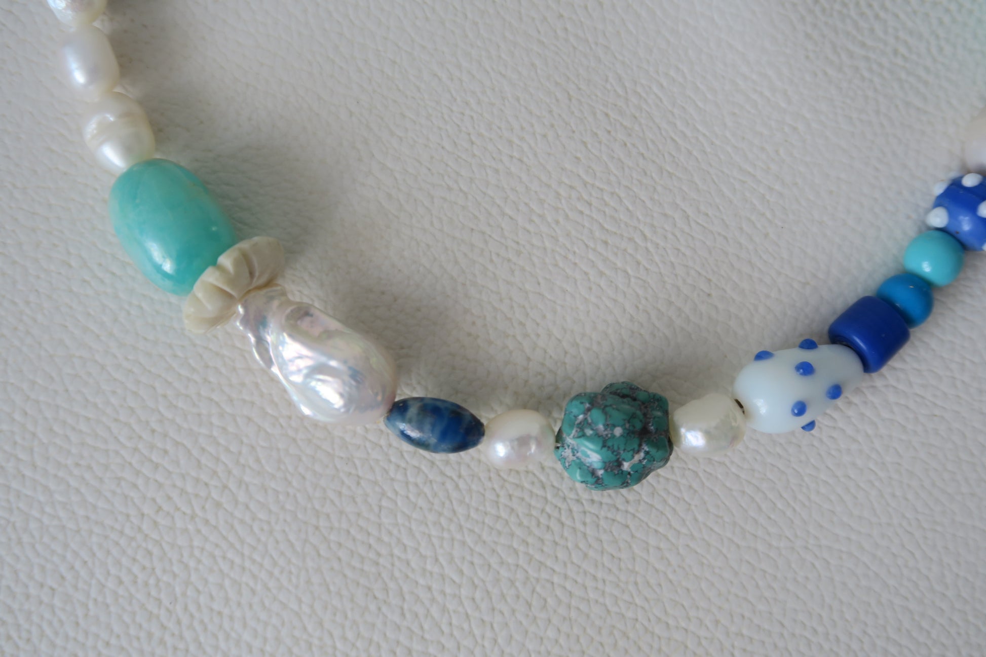 A unique, one-off necklace made with recycled and vintage beads, freshwater pearls, stone and tarnish resistant gold plated hardware. Includes rare vintage Nepalese turquoise.