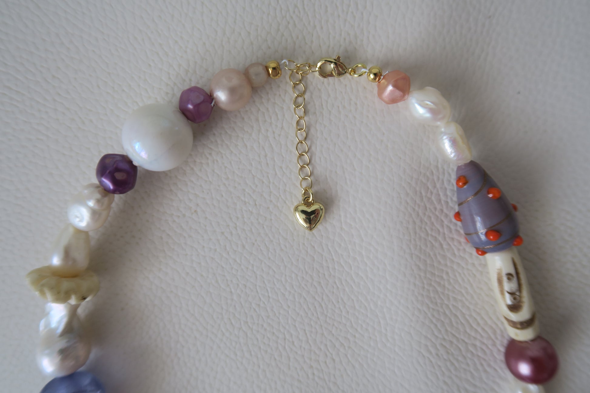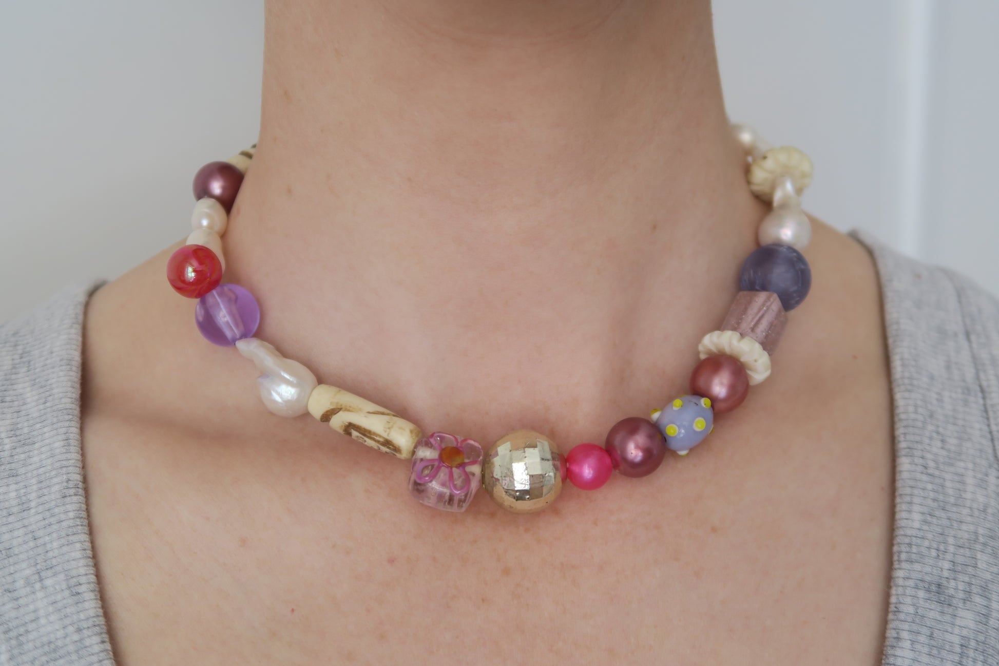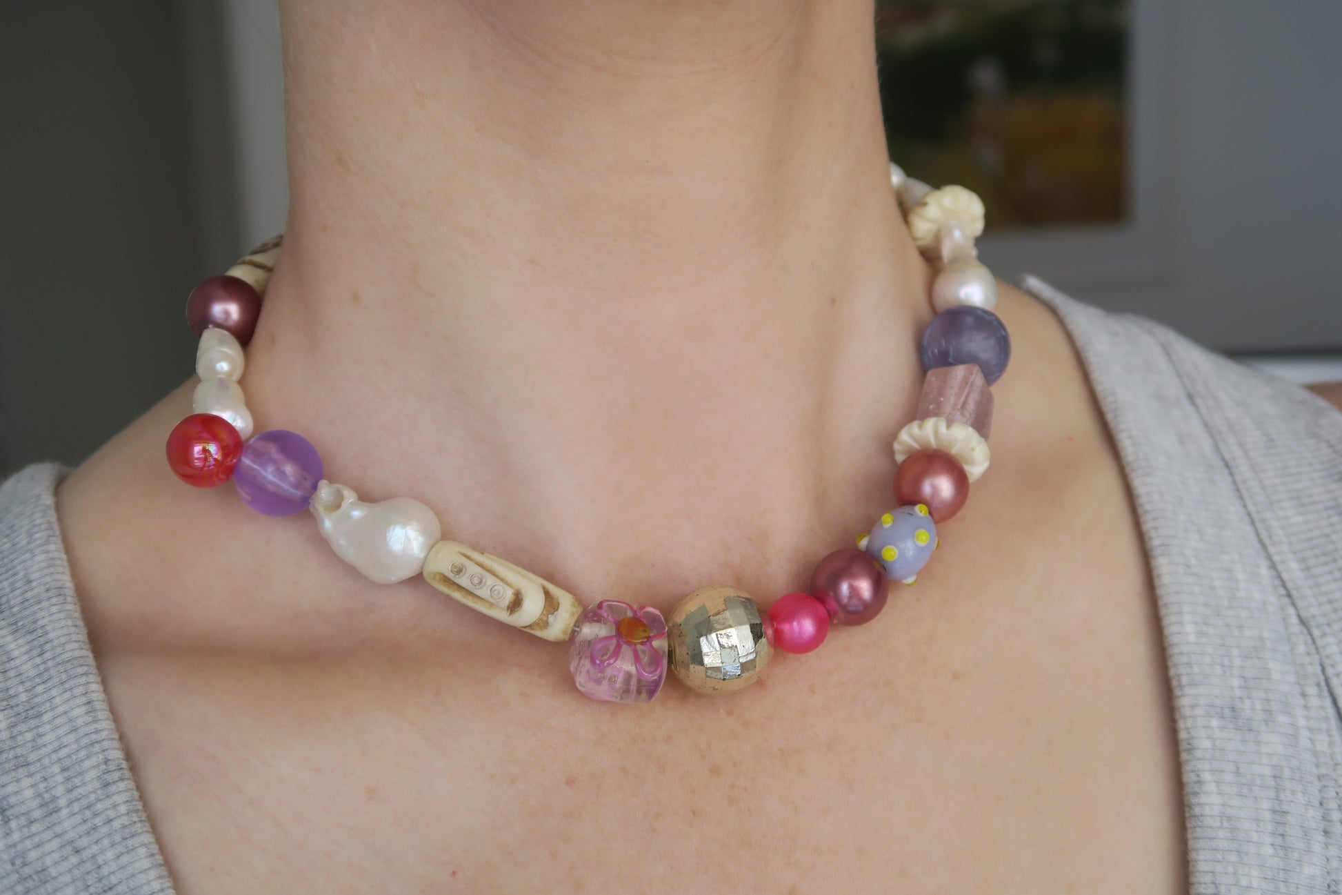 A unique, one-off necklace made with recycled and vintage beads, freshwater pearls and tarnish resistant gold plated hardware. Includes rare vintage Tibetan yak bone beads.