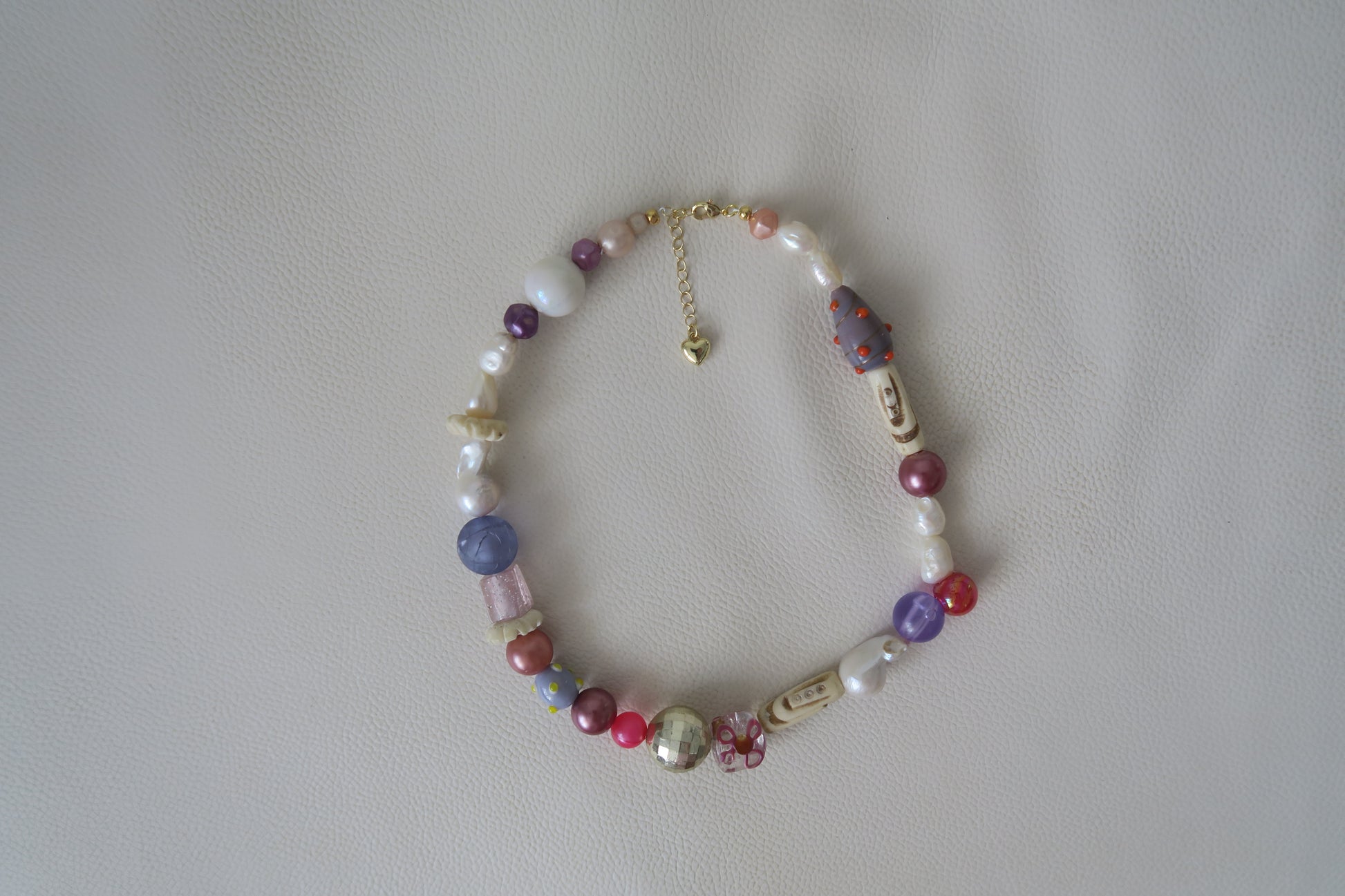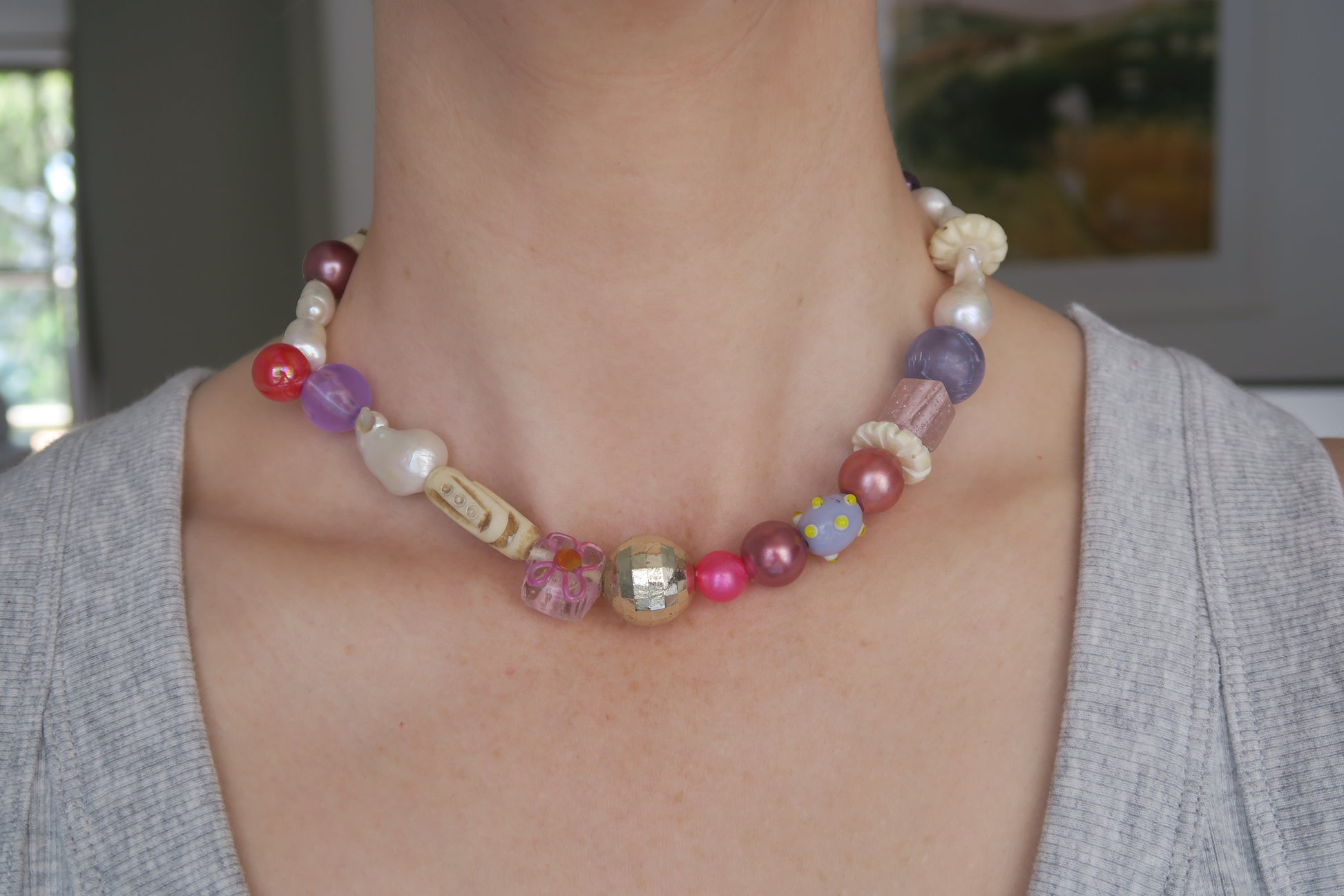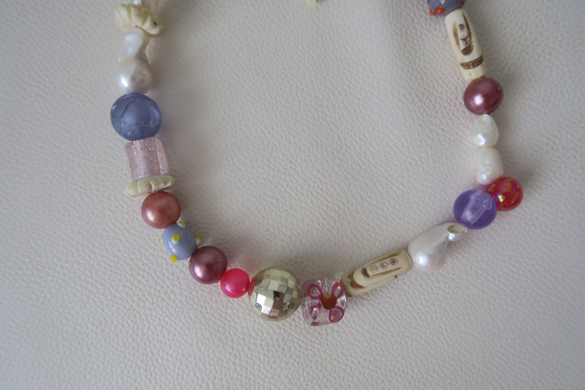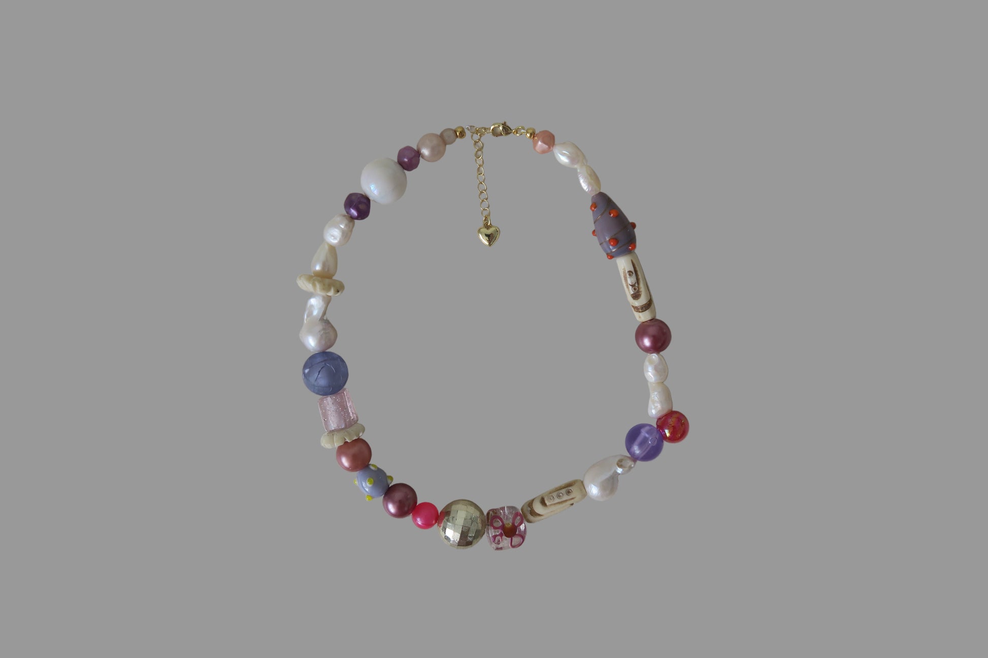 A unique, one-off necklace made with recycled and vintage beads, freshwater pearls and tarnish resistant gold plated hardware. Includes rare vintage Tibetan yak bone beads.
