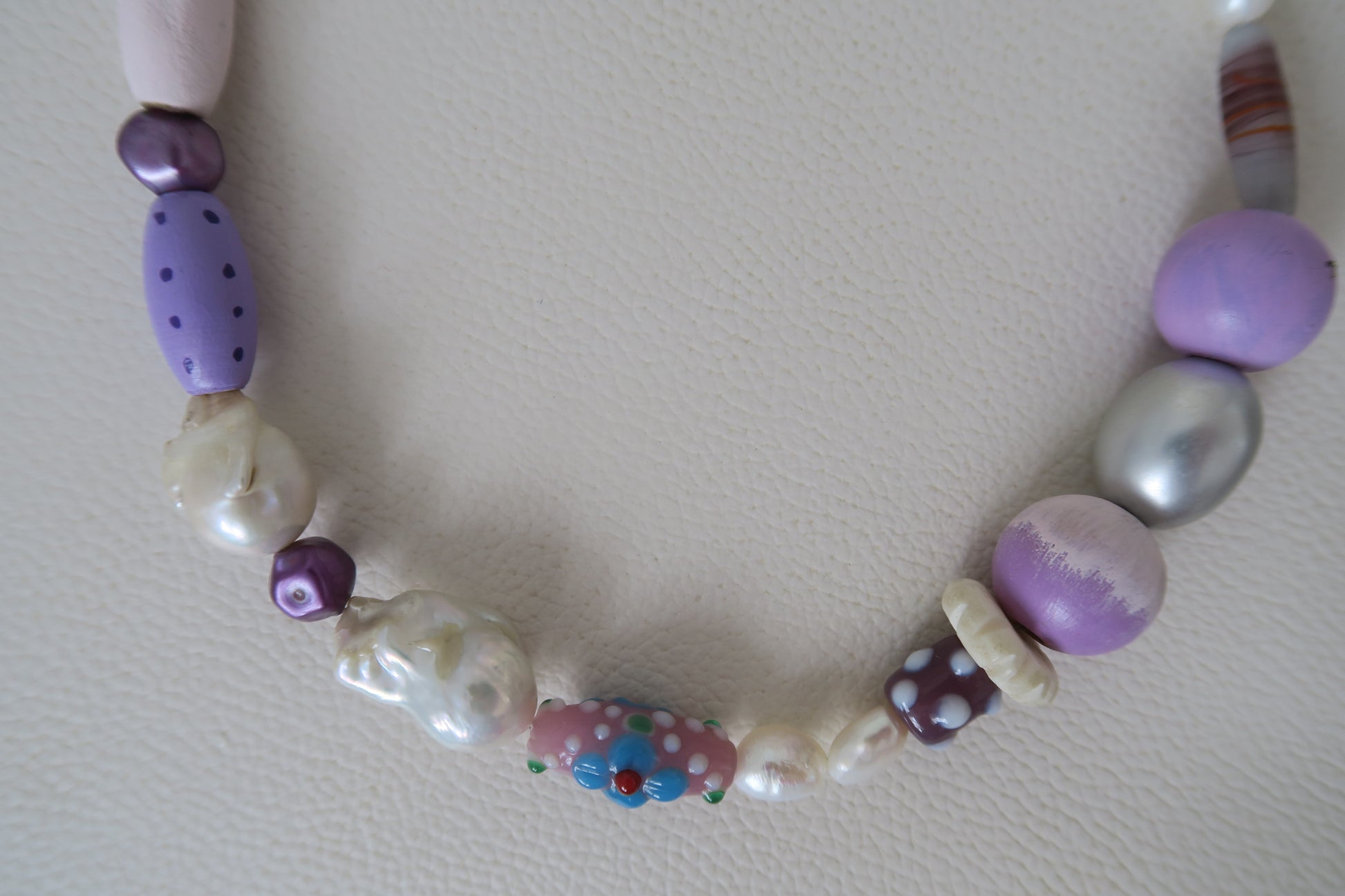 A unique, one-off necklace made with recycled and vintage beads, freshwater pearls, hand painted wooden beads, stone and tarnish resistant gold plated hardware.