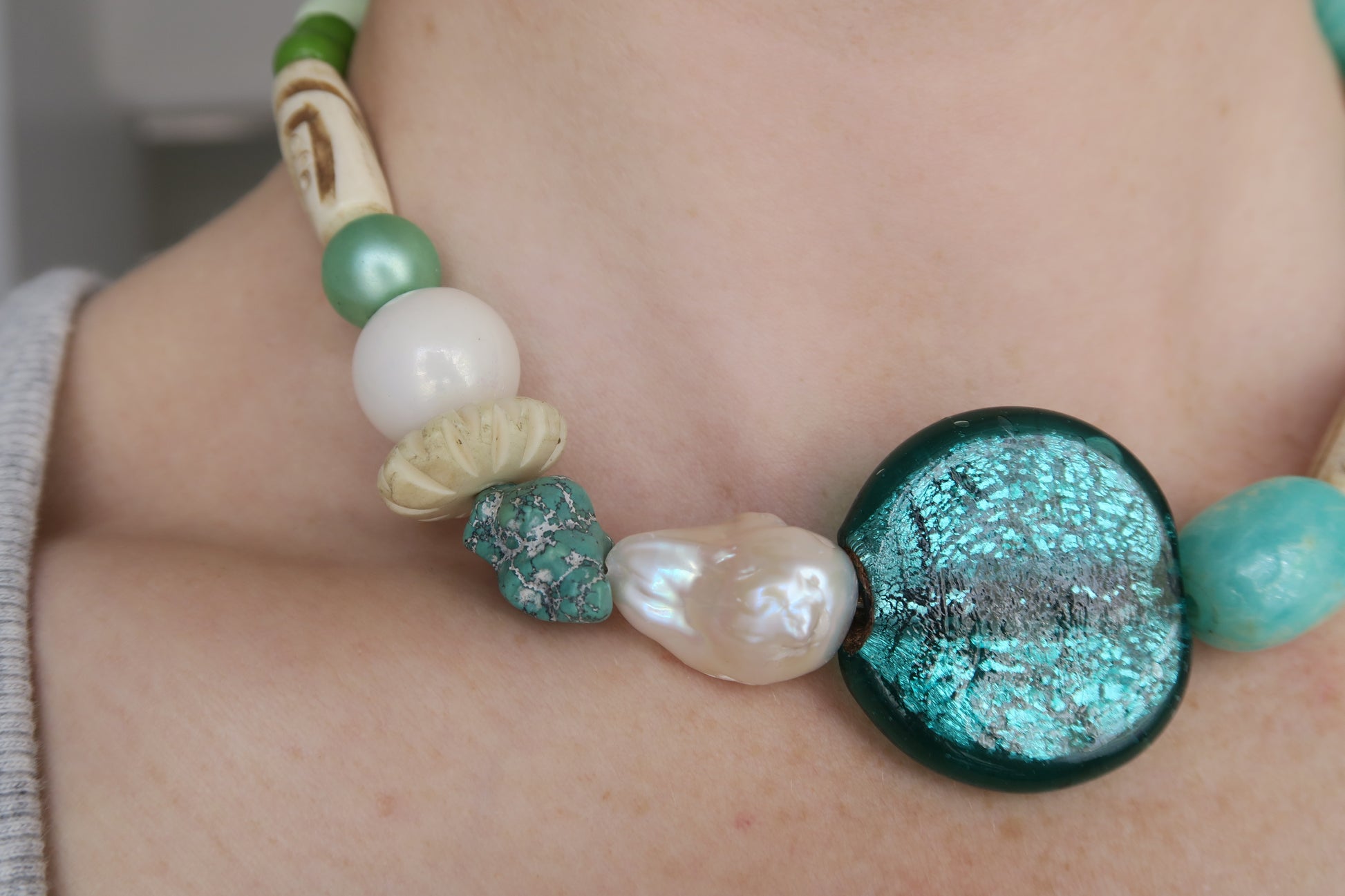A unique, one-off necklace made with recycled and vintage beads, freshwater pearls, hand painted wooden beads, stone and tarnish resistant gold plated hardware. Includes rare vintage Nepalese turquoise and Tibetan yak bone beads.