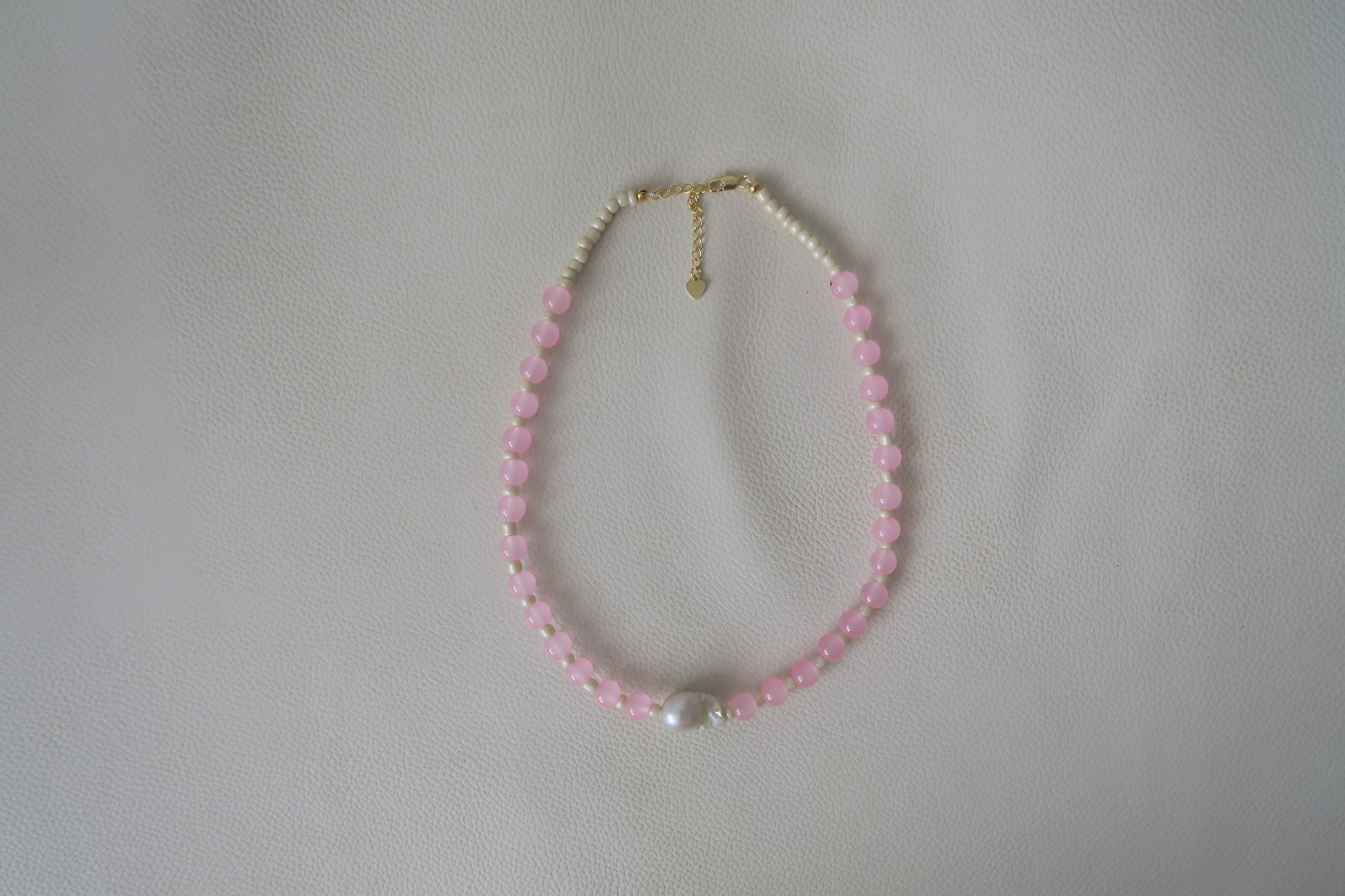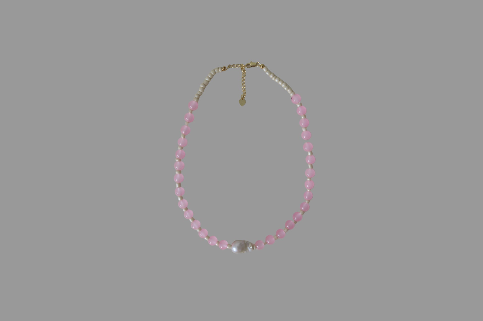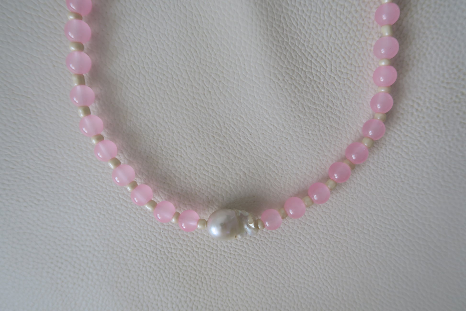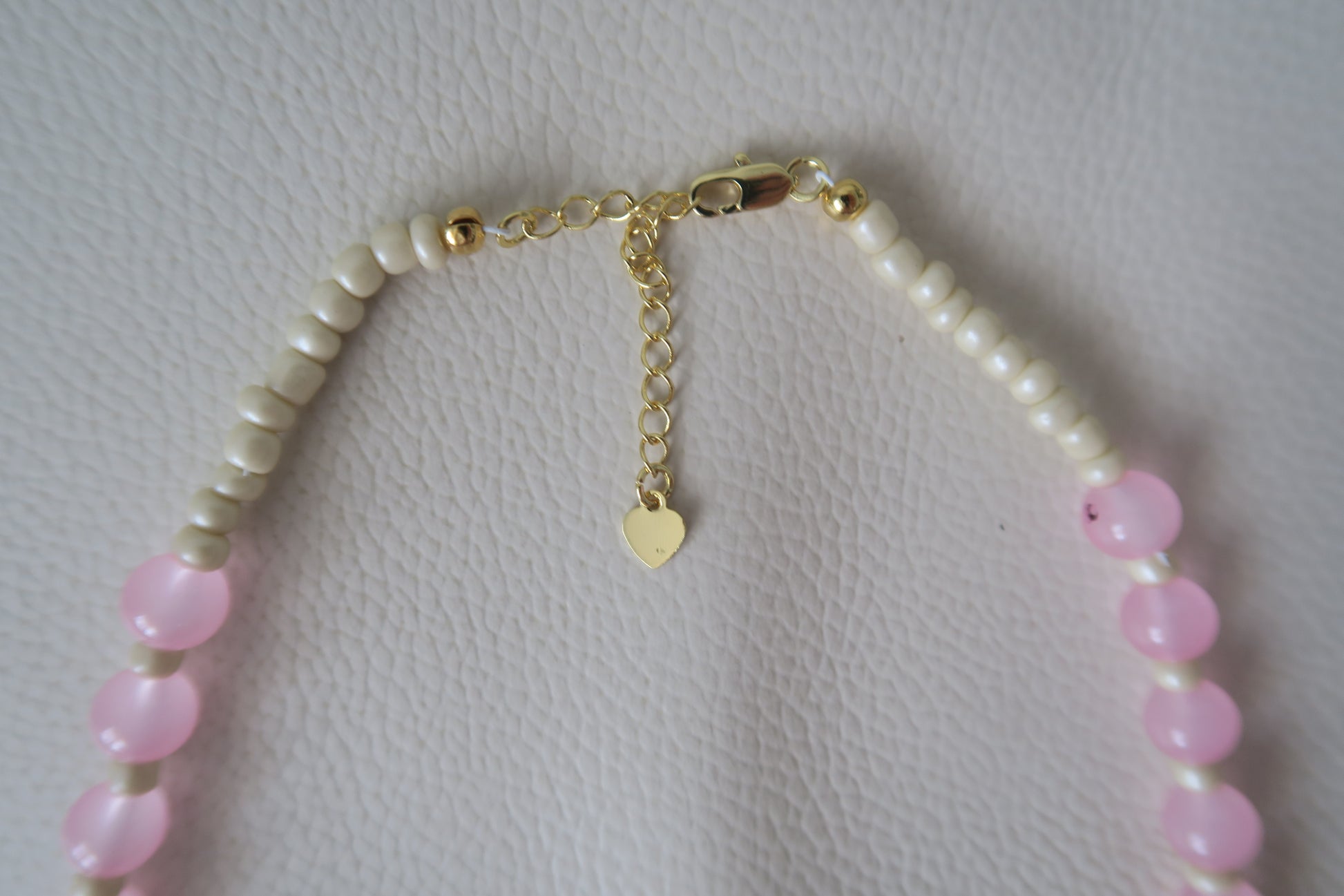 Necklace made with seed and coated glass beads, chunky freshwater pearl and tarnish resistant gold plated hardware.