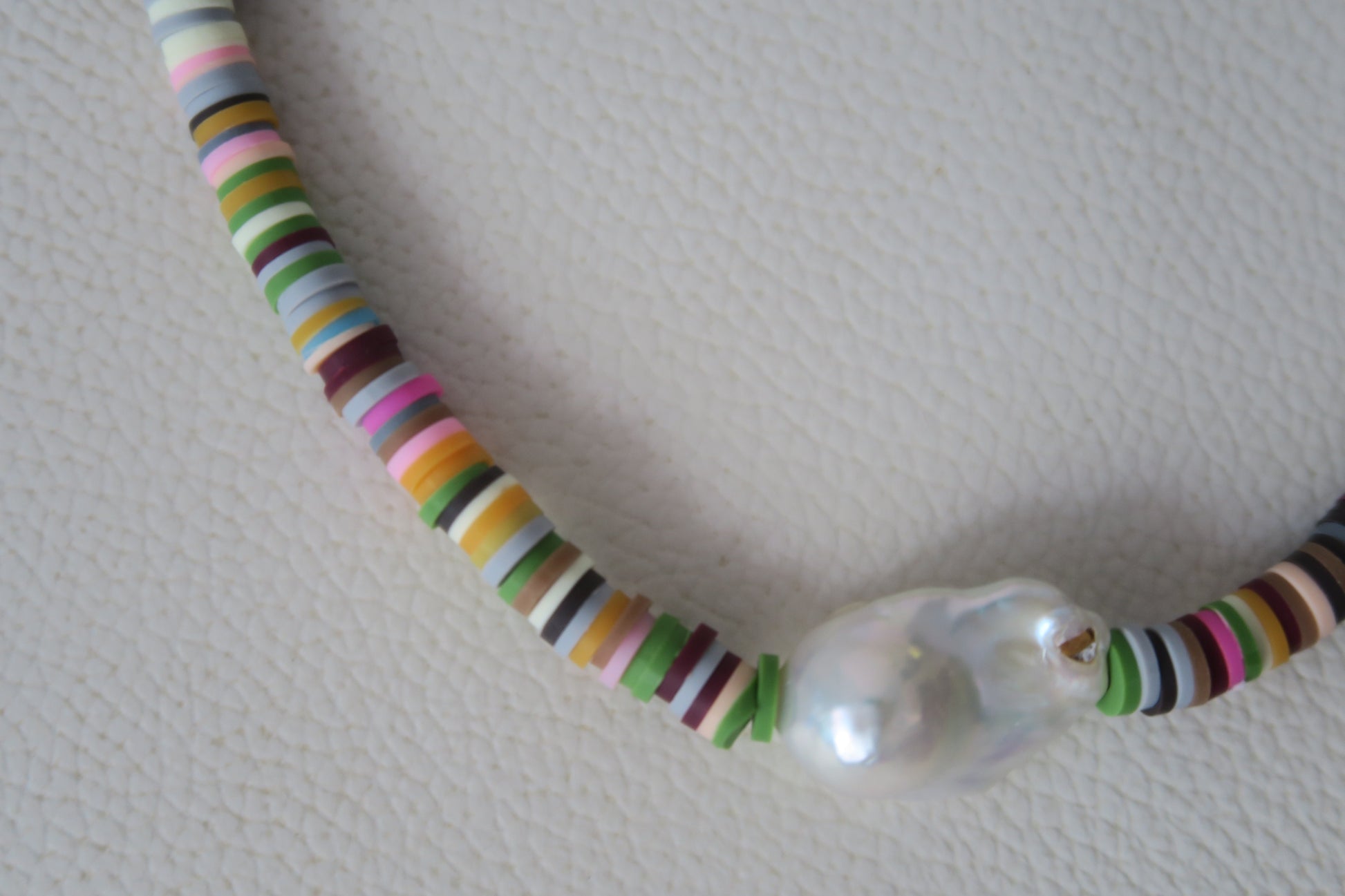 Necklace made with clay beads, chunky freshwater pearl and tarnish resistant gold plated hardware.